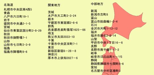 東京都千代田区・中央区・港区・新宿区・文京区・台東区・墨田区・江東区・品川区・目黒区・大田区・世田谷区・渋谷区・中野区・杉並区・豊島区・北区・荒川区・板橋区・練馬区・足立区・葛飾区・江戸川区・八王子市・立川市・武蔵野市・三鷹市・青梅市・府中市・昭島市・調布市・町田市・小金井市・小平市・日野市・東村山市・国分寺市・国立市・福生市・狛江市・東大和市・清瀬市・東久留米市・武蔵村山市・多摩市・稲城市・羽村市・あきる野市・東東京市他